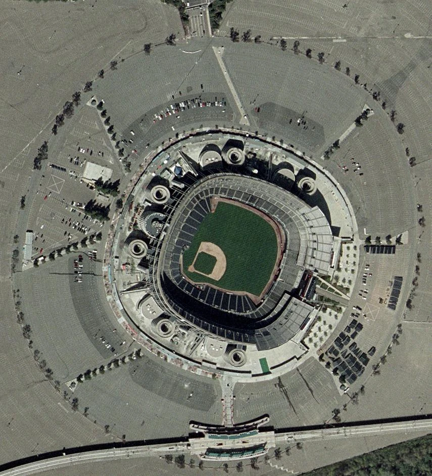 Satellite view of then-Qualcomm Stadium in March 2003, with the trolley line at the bottom of the image.